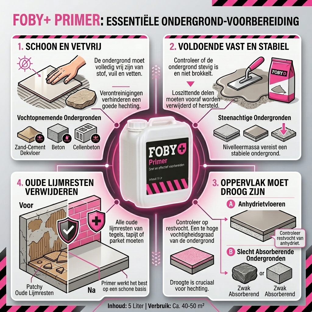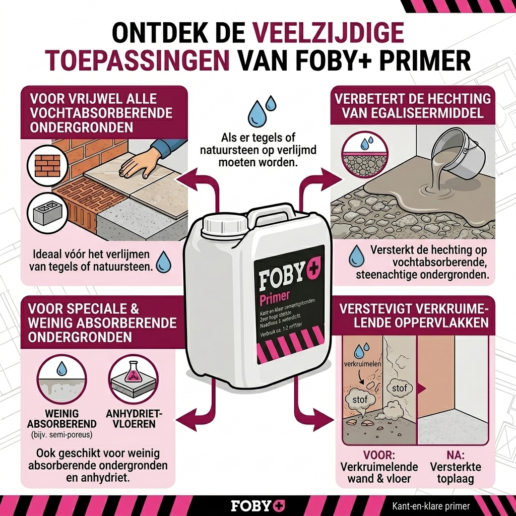 Foby+ Primer is een gebruiksklare voorstrijkmiddel die uitstekend geschikt is voor bijna alle vochtabsorberende ondergronden waarop tegels of natuursteen gelijmd moeten worden. Deze primer is waterdicht en niet-brandbaar, en kenmerkt zich door een hoge impregnatiecapaciteit. De verpakking bevat 5 liter, goed voor een dekking van 40-50 m². Het is essentieel dat de ondergrond schoon, vast en droog is voor het aanbrengen van dit product.